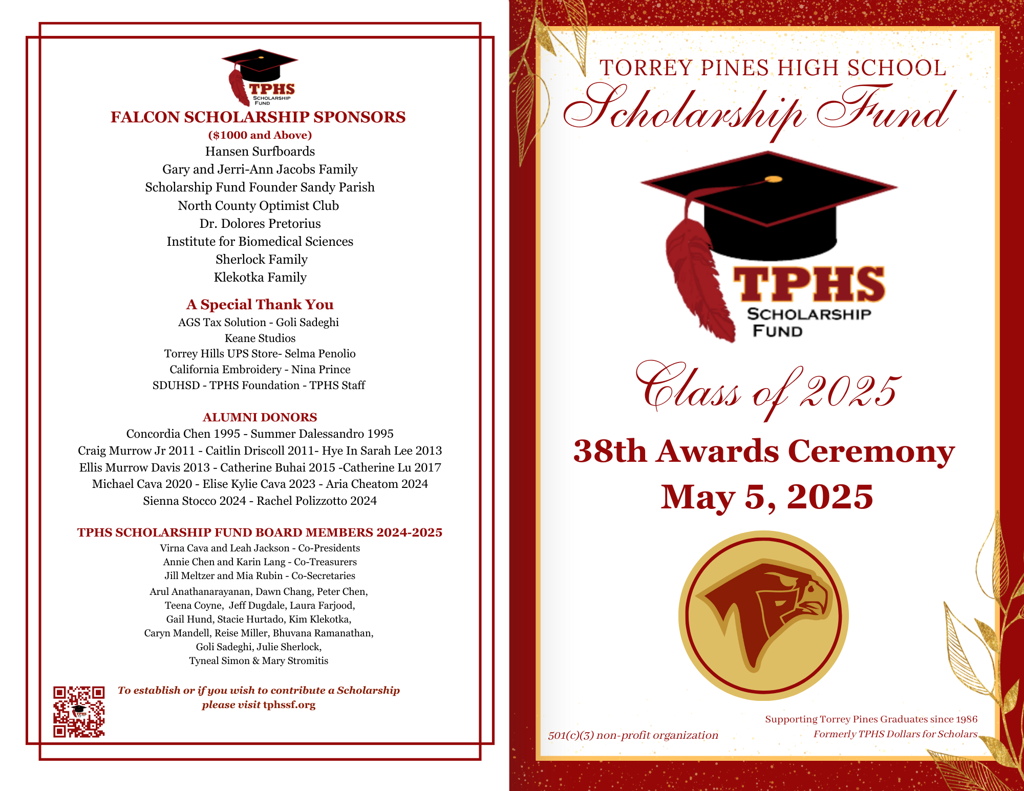 Since 1986, the Torrey Pines High School Scholarship Fund program (originally TPHS Dollars for Scholars) has focused on one mission. Our volunteers recognize promising TPHS Seniors who wish to further their education (2 yr college, 4 yr university or trade schools) with scholarship funds.